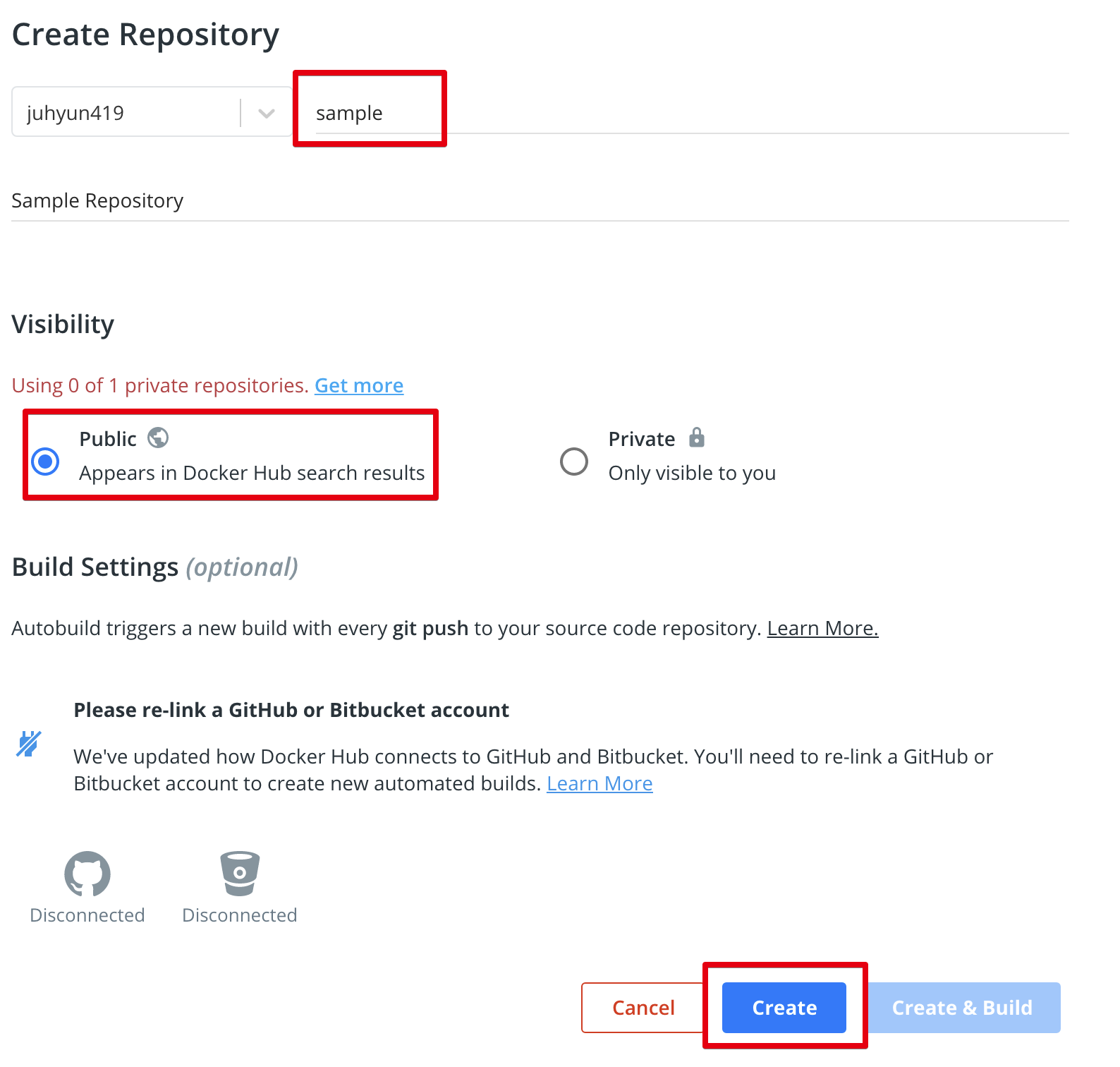 Repository 이름과 Public으로 설정하고 Create 를 클릭합니다.