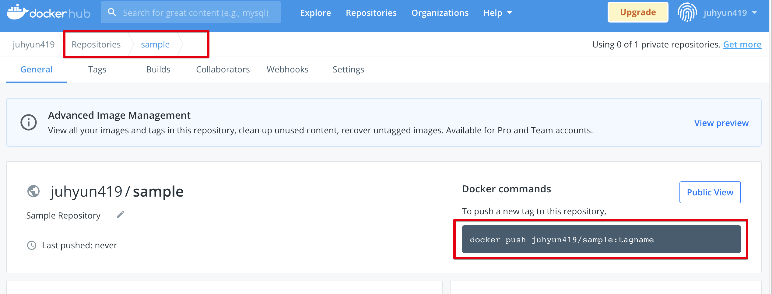 push 명령어는 docker hub의 Repository에 보면 확인할 수 있습니다.
