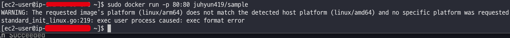 만약 --platform linux/amd64 옵션을 추가하지 않고 빌드를 하면 아래와 같은 에러가 발생합니다. 😭