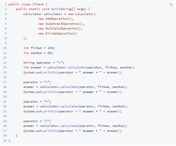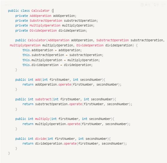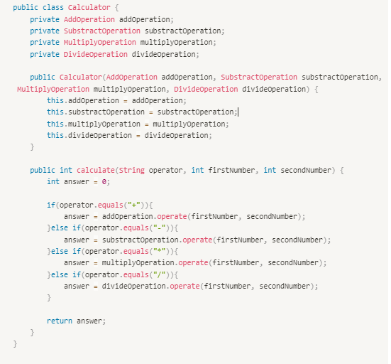 - 계산기(고수준 모듈)가 개별 연산 클래스(저수준 모듈)을 포함하며 계산 기능을 구현할 때 연산 클래스에 의존하고 있습니다.