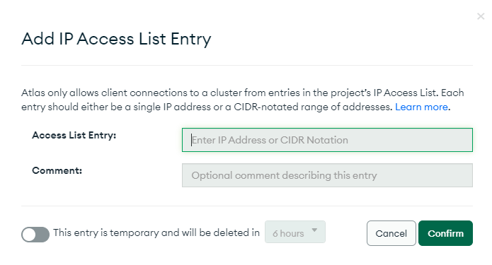 Access List Entry : 0.0.0.0, comment (includes your current IP address) 입력 후 Confirm 클릭