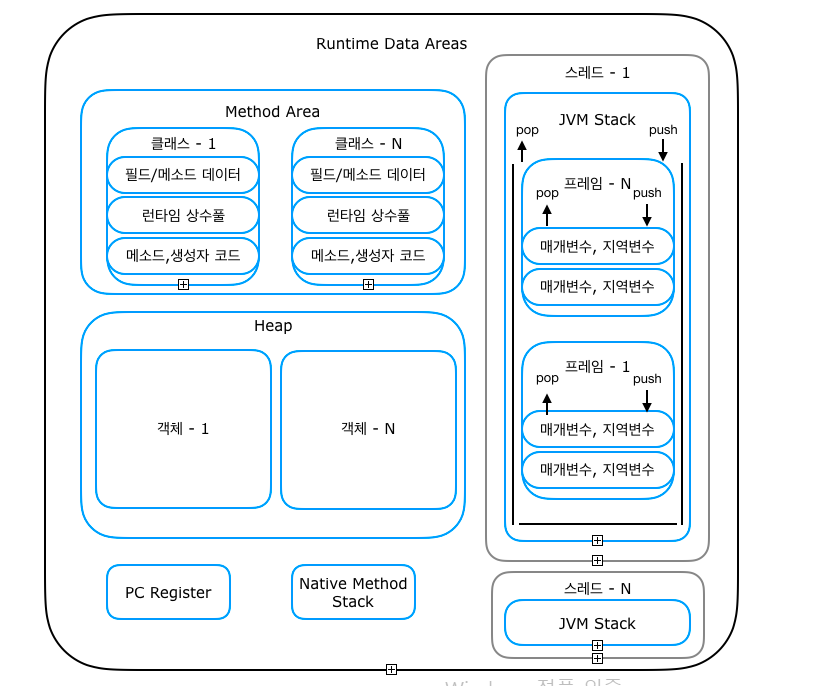 - Runtime Constant Pool : 상수 자료형을 저장하여 참조하고 중복을 막는 역할을 수행